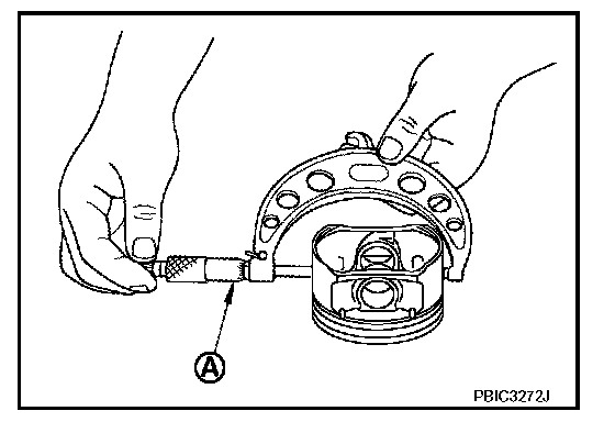 Measure the outer diameter of piston skirt with a micrometer (A).