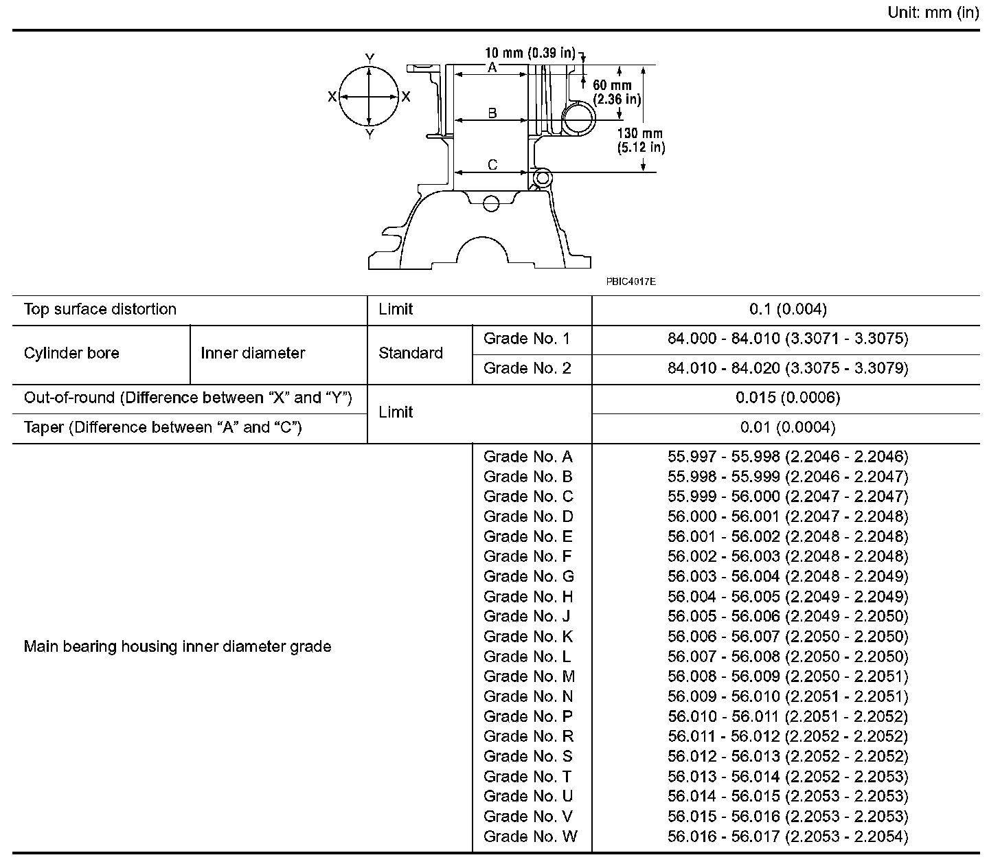 ^ If clearance exceeds the limit, select proper main bearing according to main bearing inner diameter and crankshaft main journal diameter to obtain specified bearing oil clearance.