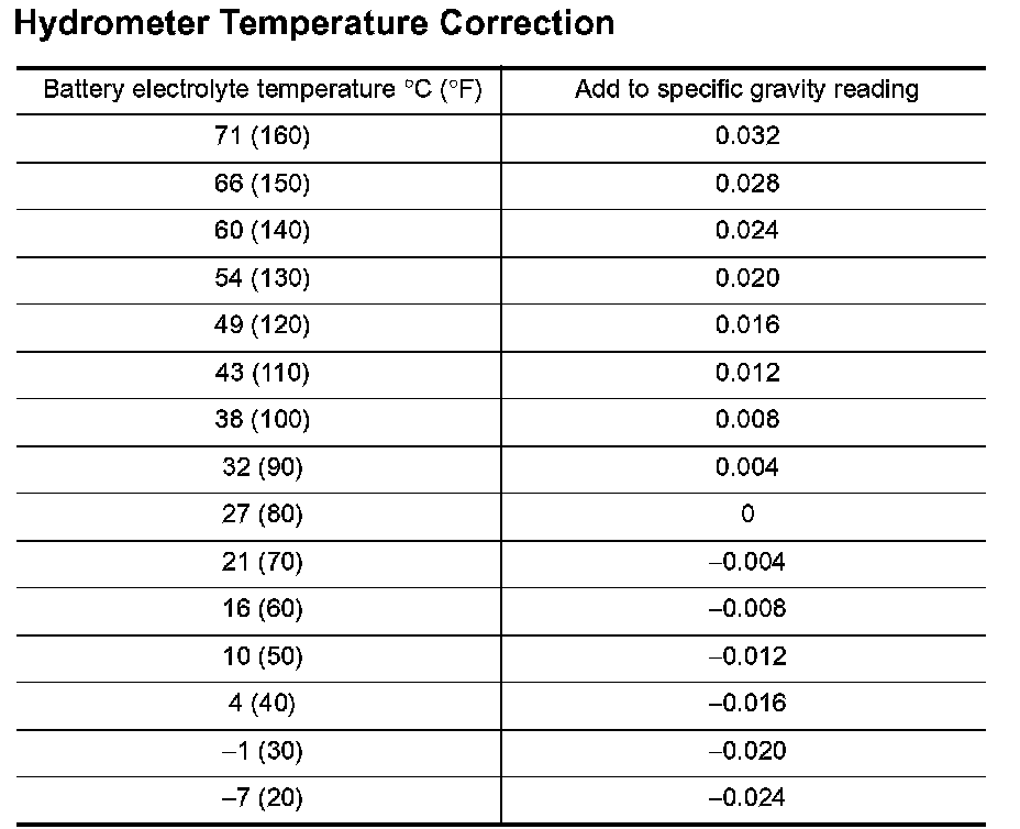 Use the given chart to correct your hydrometer reading according to electrolyte temperature.