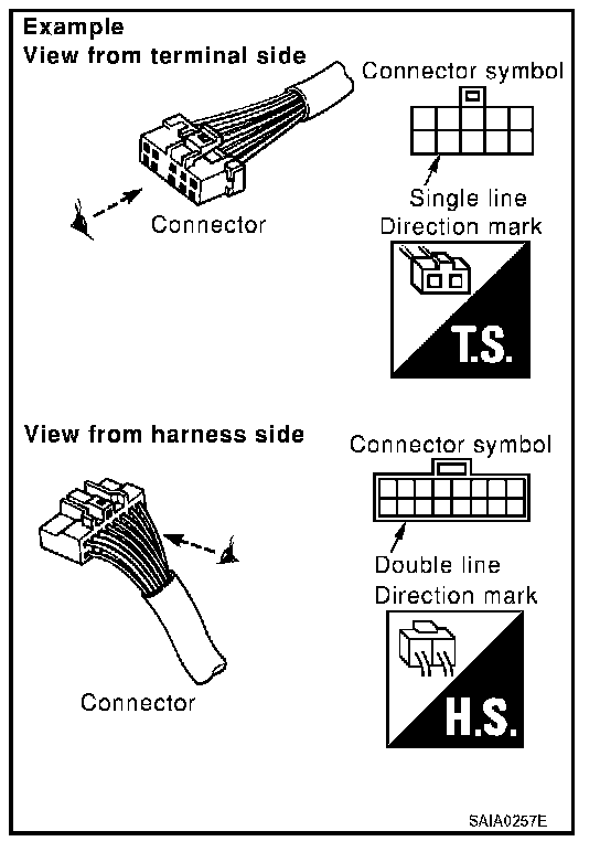 - Connector symbols shown from the harness side are enclosed by a double line and followed by the direction mark.