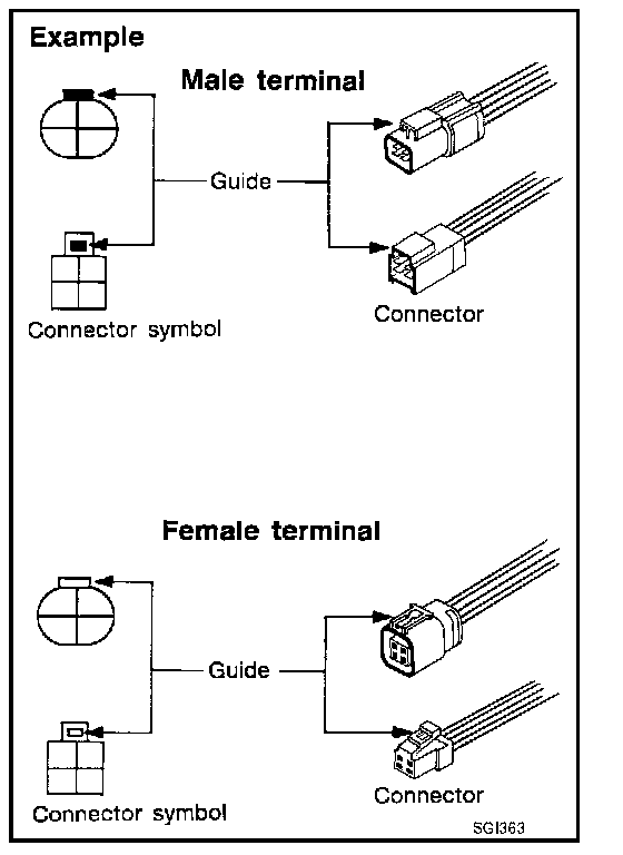 Most of connector symbols in wiring diagrams are shown from the terminal side.