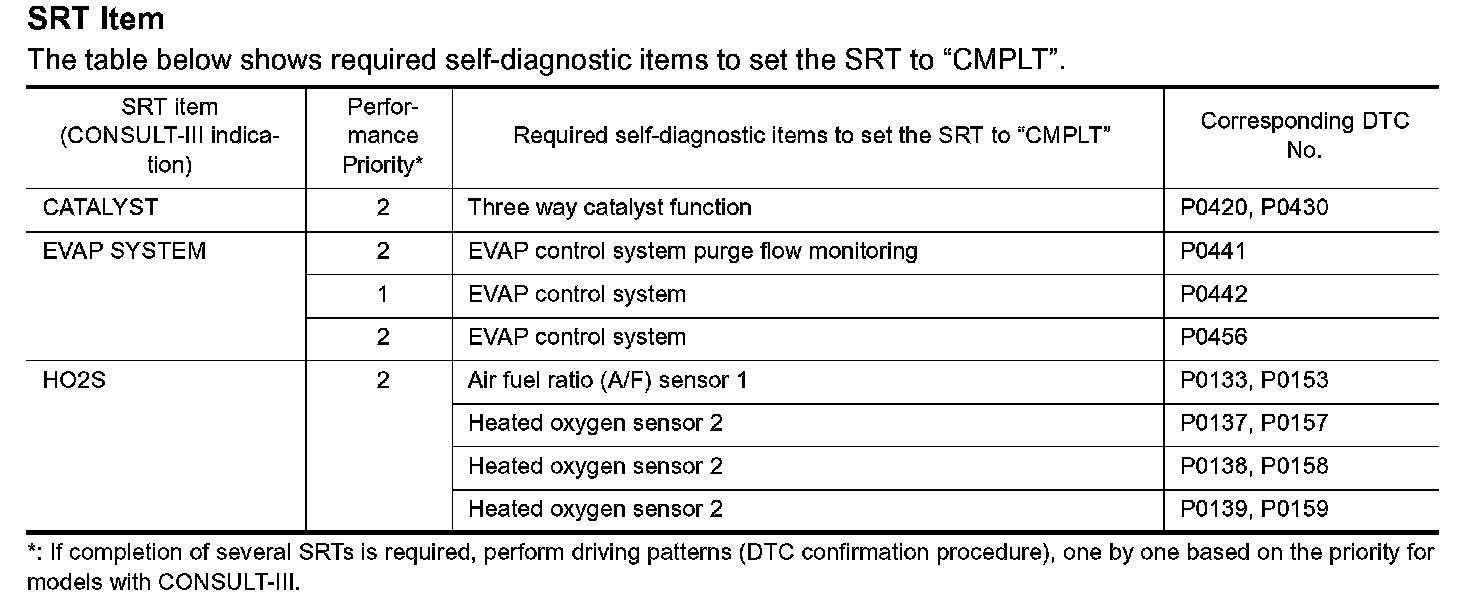 To set all SRT codes, self-diagnosis for the items indicated above must be performed one or more times. Each diagnosis may require a long period of actual driving under various conditions.