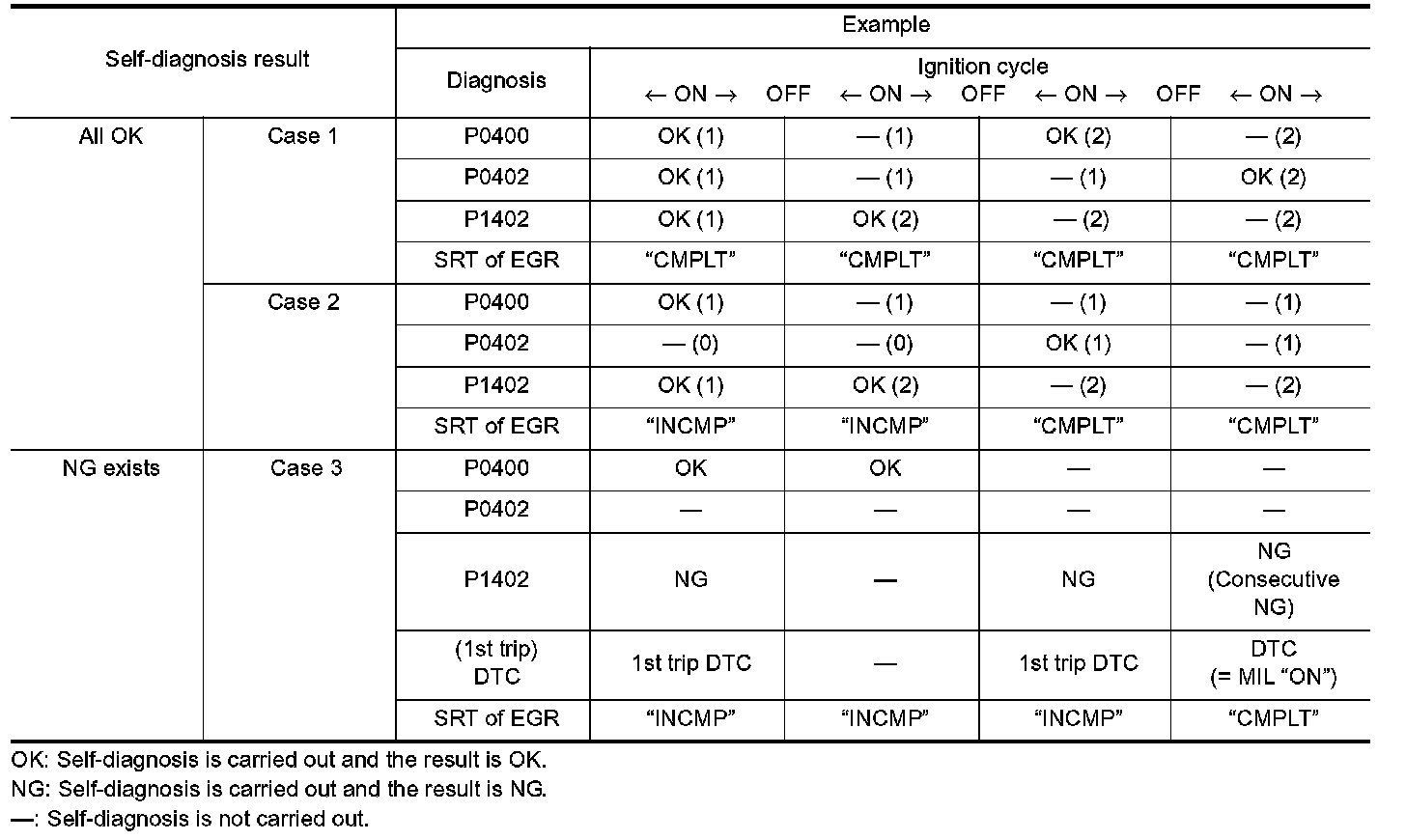 SRT is set as "CMPLT" after self-diagnosis has been performed one or more times. Completion of SRT is done regardless of whether the result is OK or NG. The set timing is different between OK and NG results and is shown in the table.