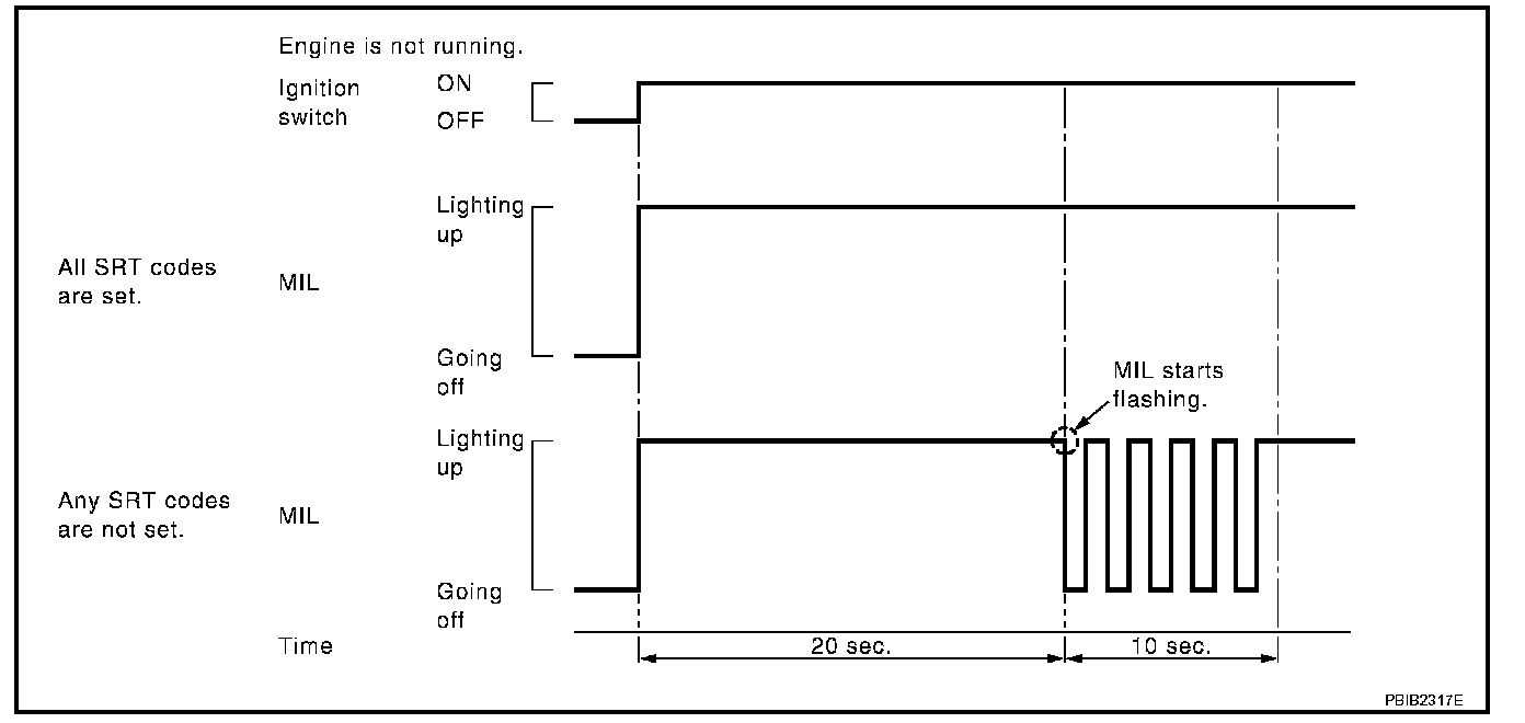 - When any SRT codes are not set, MIL will flash periodically for 10 seconds.
