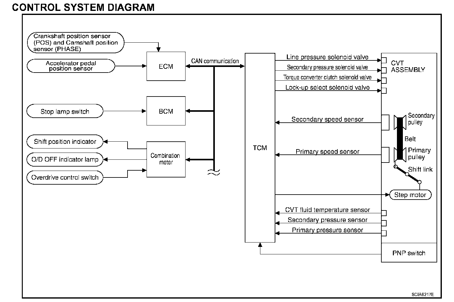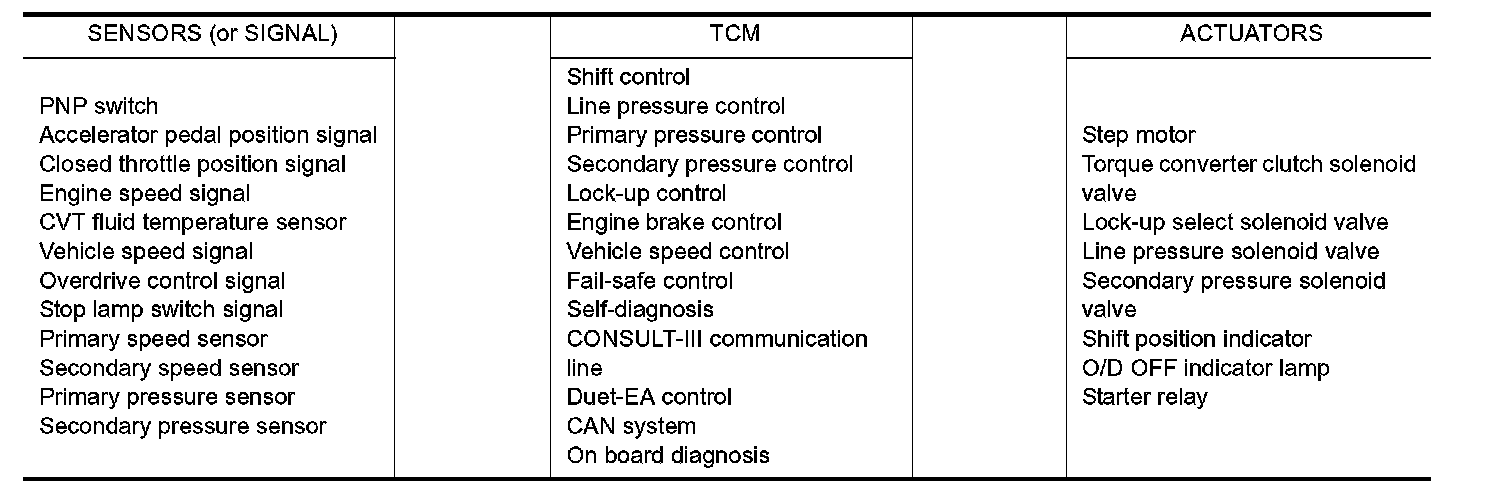 The CVT senses vehicle operating conditions through various sensors. It always controls the optimum shift position and reduces shifting and lock-up shocks.