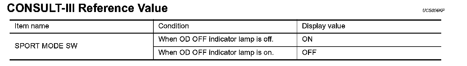 Check overdrive control switch. Refer to CVT-162, "Component Inspection". Overdrive Control Switch