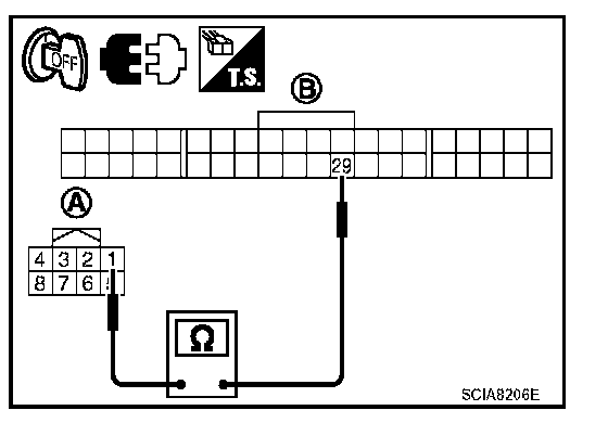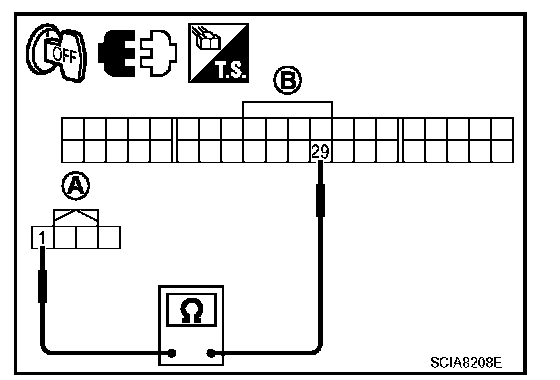 3. Check continuity between CVT device harness connector (A) terminal and combination meter harness connector (B) terminal.