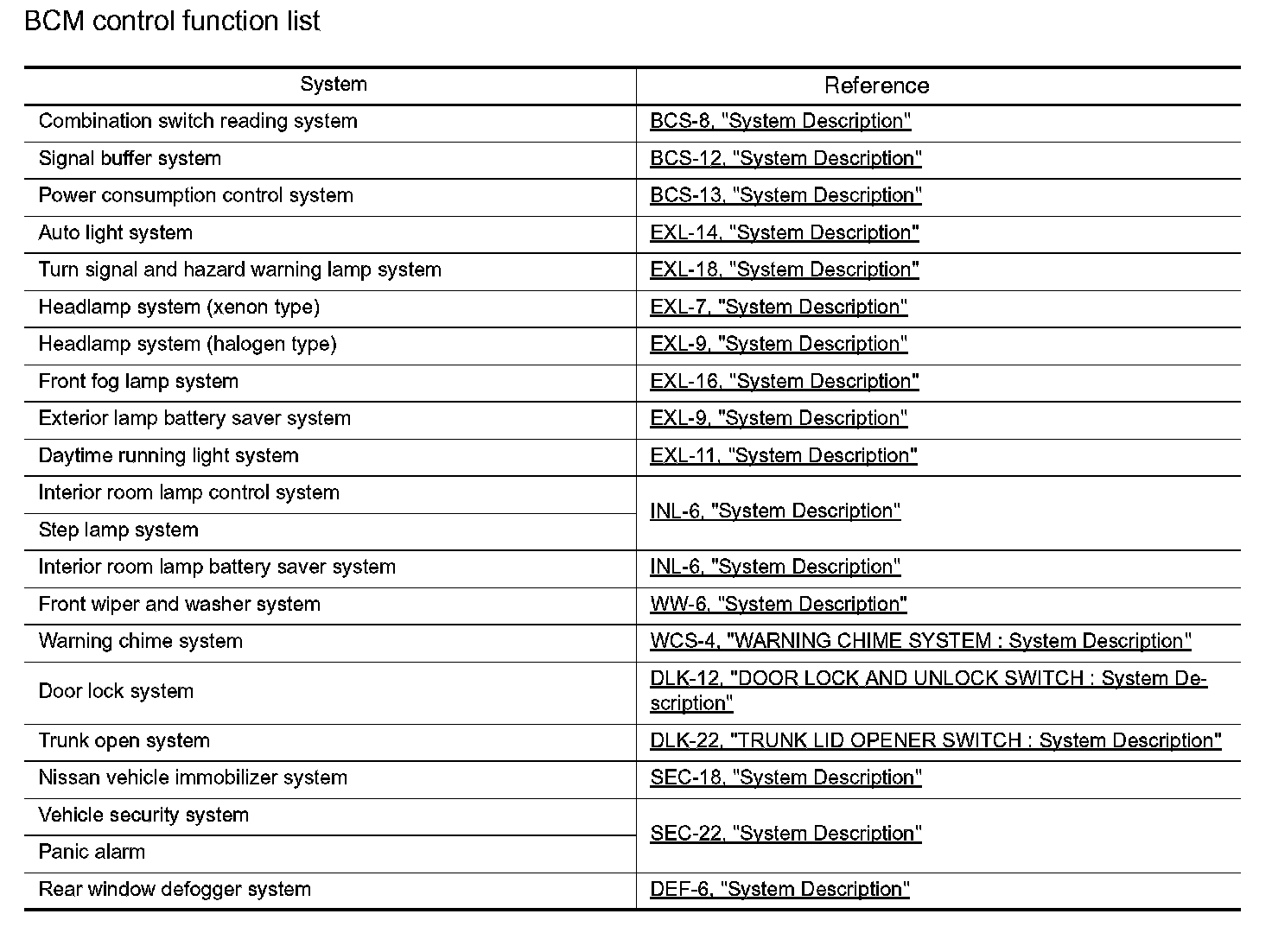 - BCM has combination switch reading function for reading the operation status of combination switches (light, turn signal, wiper and washer) in addition to a function for controlling the operation of various electrical components. It also has the signal transmission function as the passed point of signal and the power saving control function that reduces the power consumption with the ignition switch OFF.