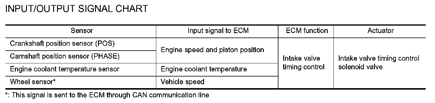 The ECM receives signals such as crankshaft position, camshaft position, engine speed, and engine coolant temperature. Then, the ECM sends ON/OFF pulse duty signals to the intake valve timing (IVT) control solenoid valve depending on driving status. This makes it possible to control the shut/open timing of the intake valve to increase engine torque in low/mid speed range and output in high-speed range.