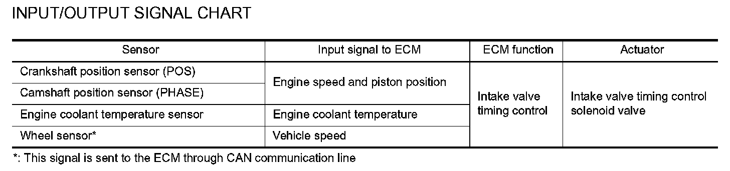 The ECM receives signals such as crankshaft position, camshaft position, engine speed, and engine coolant temperature. Then, the ECM sends ON/OFF pulse duty signals to the intake valve timing (IVT) control solenoid valve depending on driving status. This makes it possible to control the shut/open timing of the intake valve to increase engine torque in low/mid speed range and output in high-speed range.