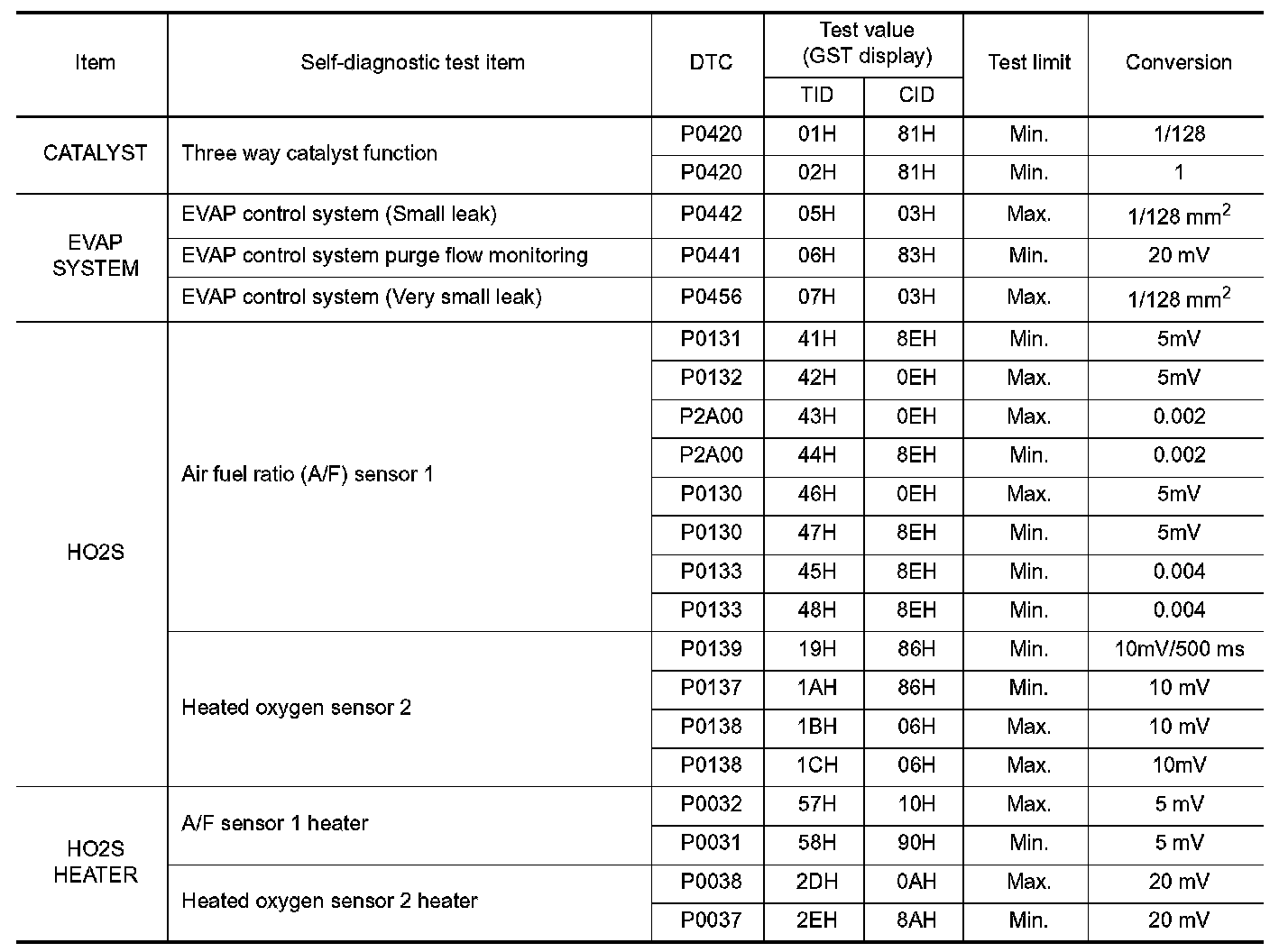 The test value is a parameter used to determine whether a system/circuit diagnostic test is OK or NG while being monitored by the ECM during self-diagnosis. The test limit is a reference value which is specified as the maximum or minimum value and is compared with the test value being monitored.