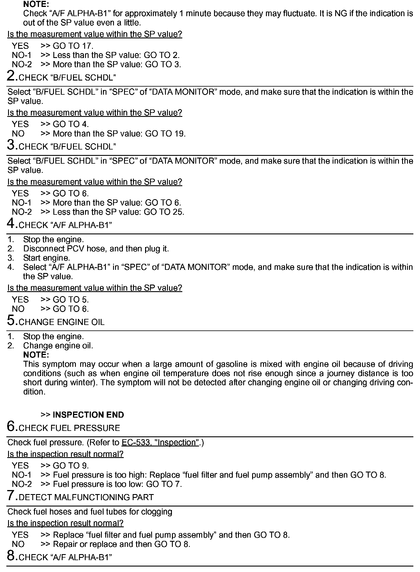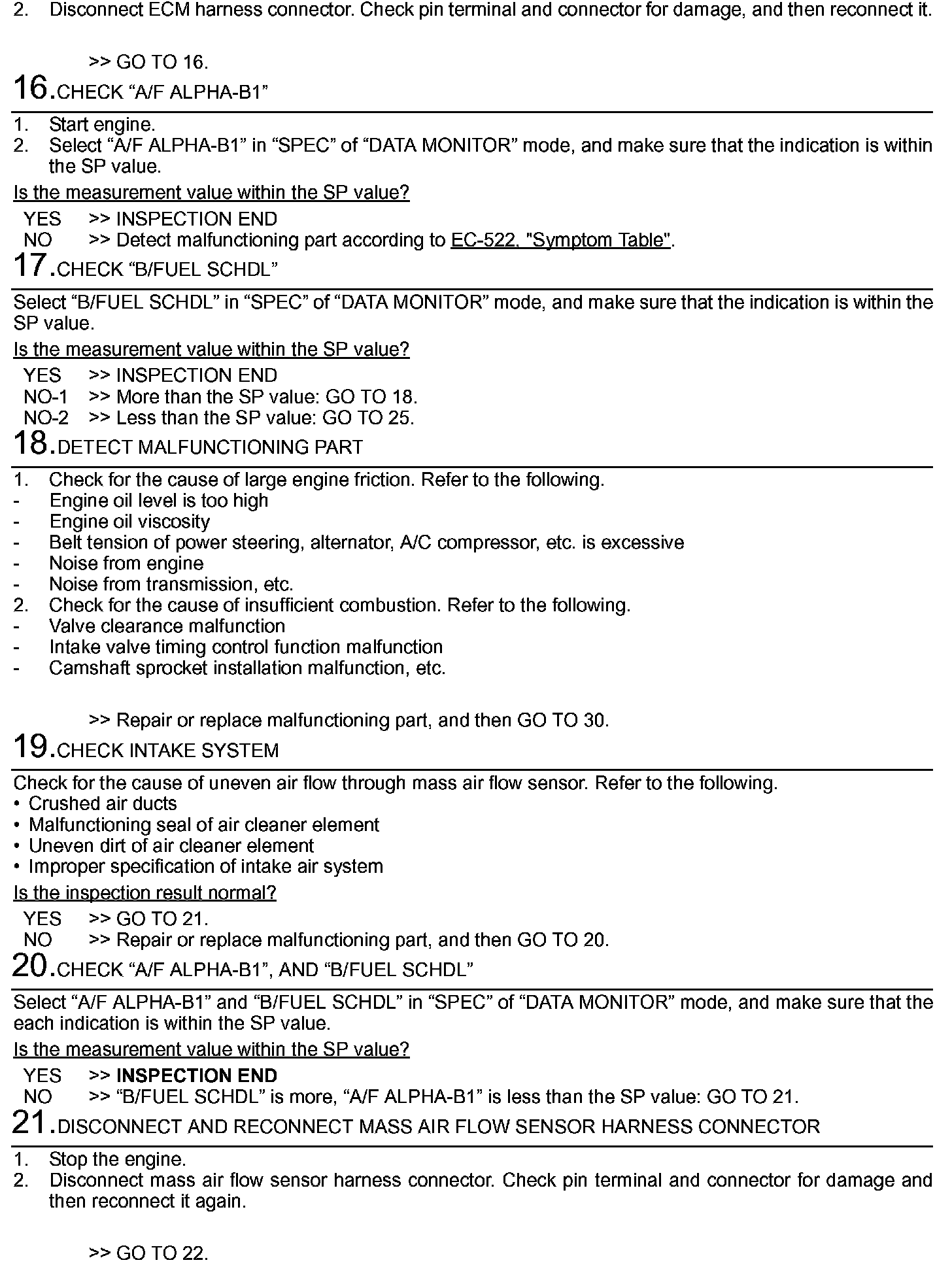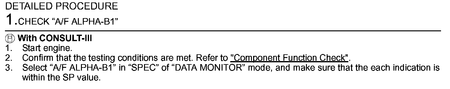 The specification (SP) value indicates the tolerance of the value that is displayed in "SPEC" of "DATA MONITOR" mode of CONSULT-III during normal operation of the Engine Control System. When the value in "SPEC" of "DATA MONITOR" mode is within the SP value, the Engine Control System is confirmed OK. When the value in "SPEC" of "DATA MONITOR" mode is NOT within the SP value, the Engine Control System may have one or more malfunctions.