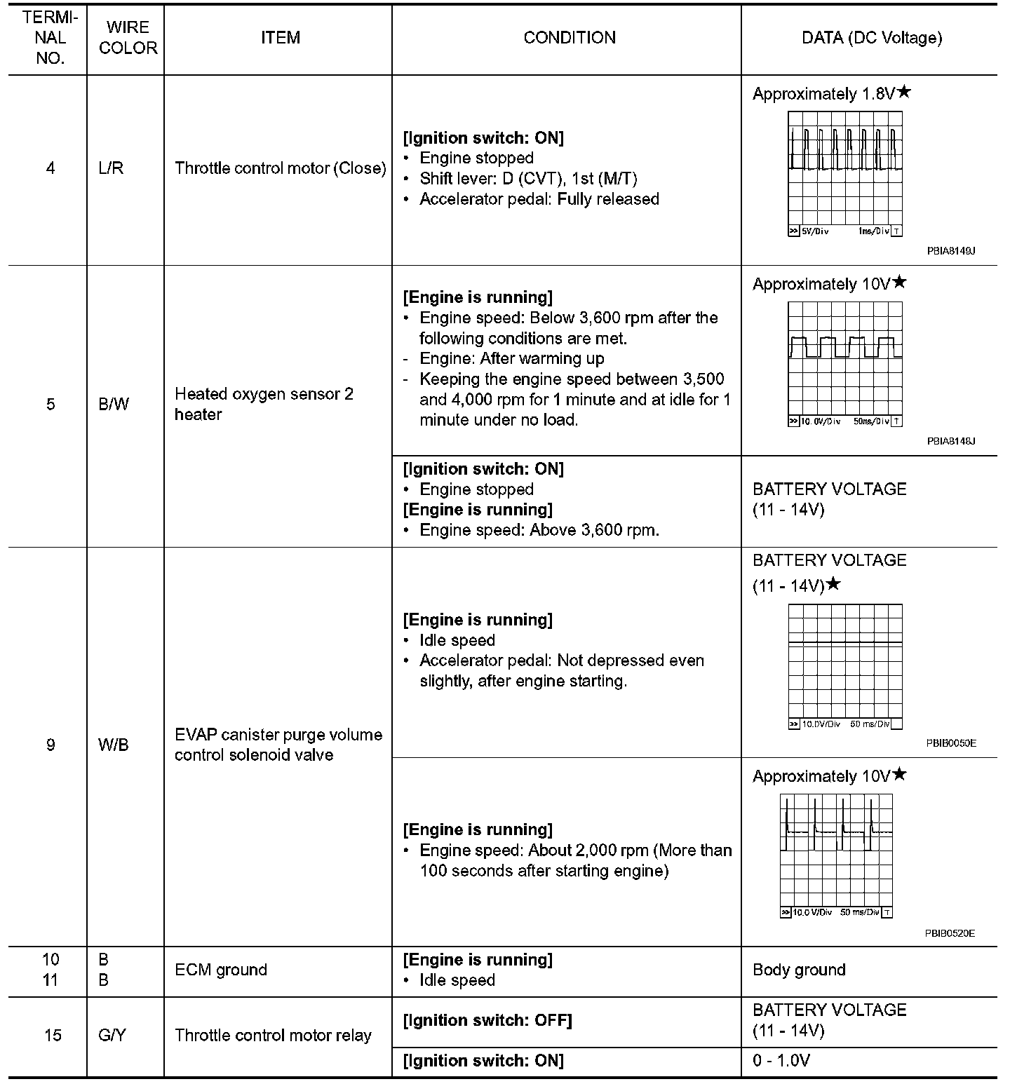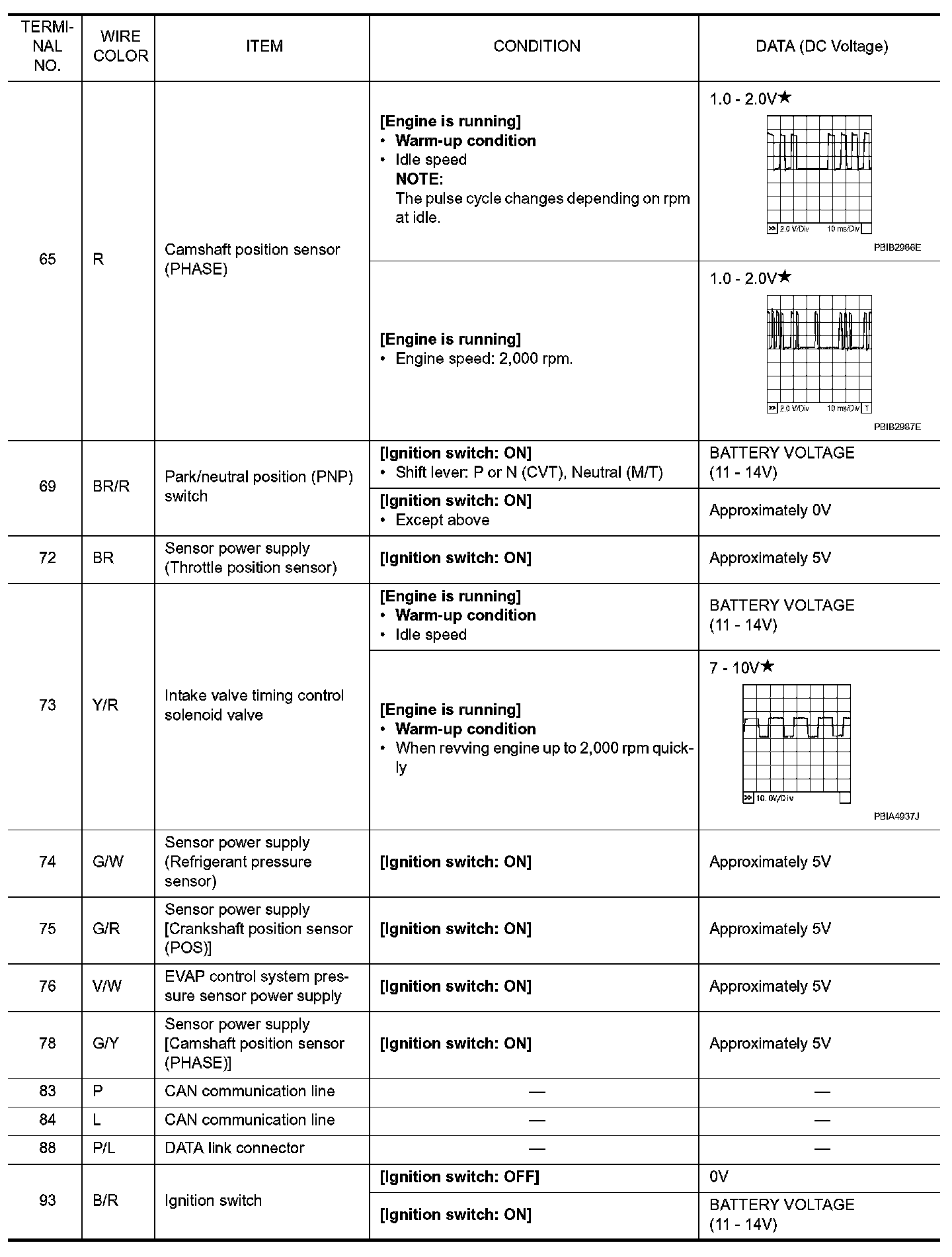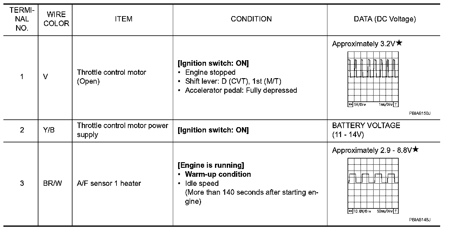 Specification data are reference values and are measured between each terminal and ground. Pulse signal is measured by CONSULT-III.