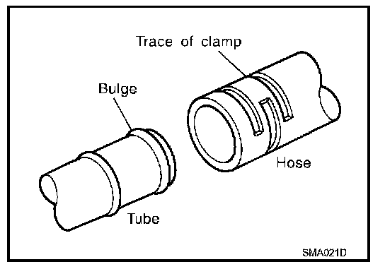 - If old rubber hose is re-used, install hose clamp in its original position (at the indentation where the old clamp was). If there is a trace of tube bulging left on the old rubber hose, align rubber hose at that position.