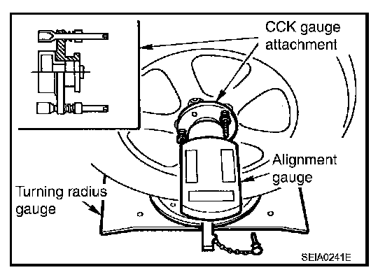 ^ Before inspection, mount front wheels onto turning radius gauge. Mount rear wheels onto a stand that has same height so vehicle will remain horizontal.