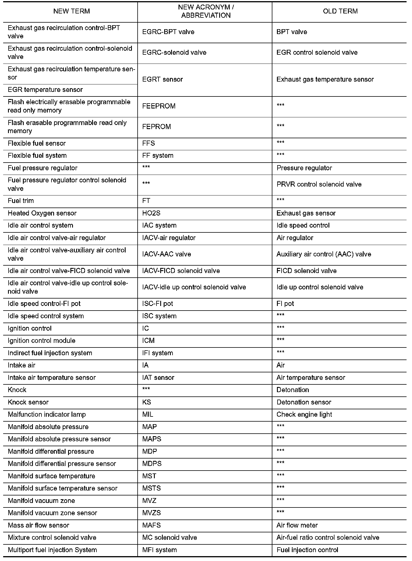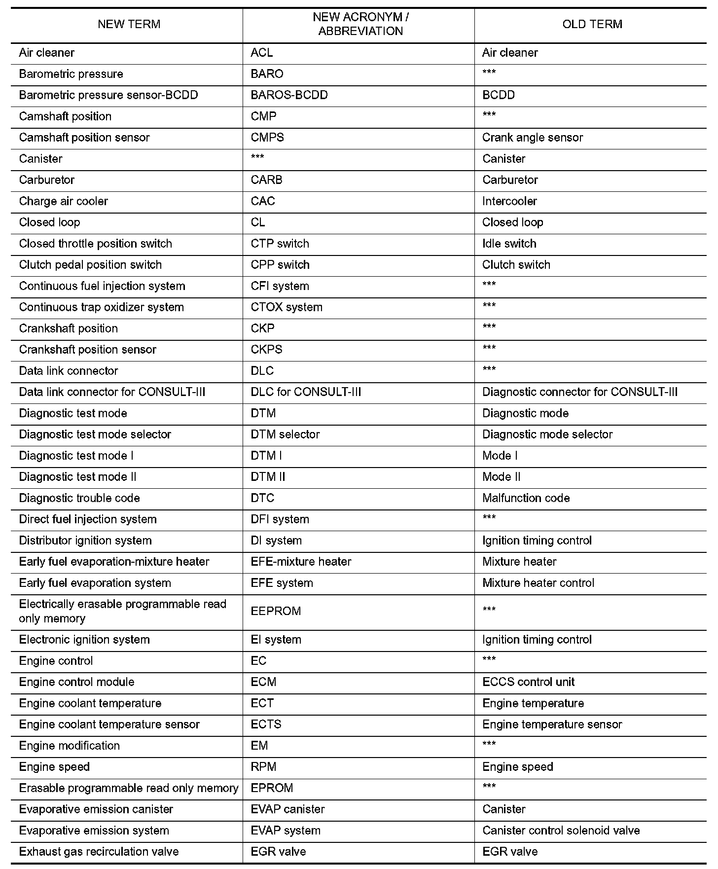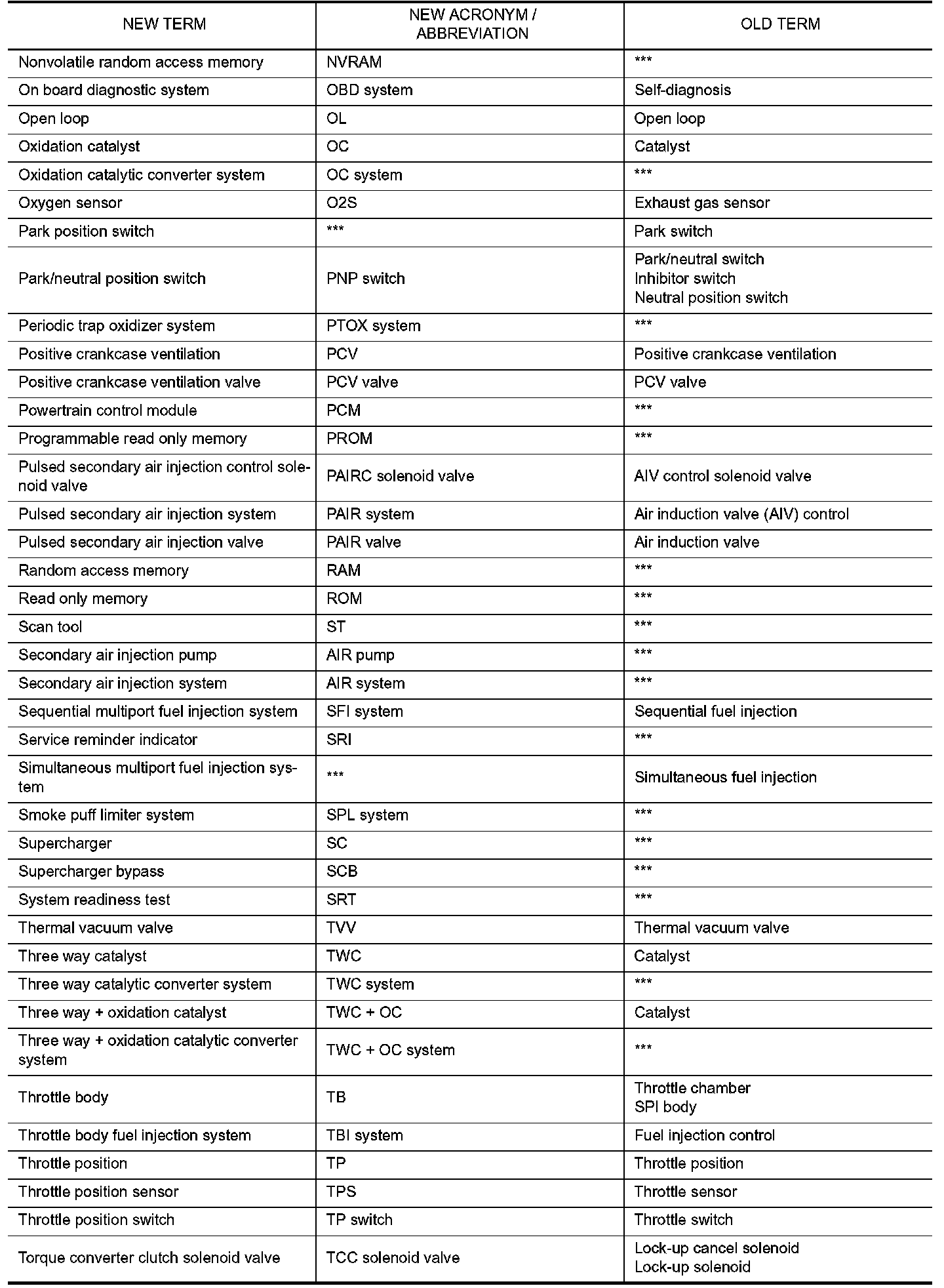 All emission related terms used in this publication in accordance with SAE J1930 are listed. Accordingly, new terms, new acronyms/abbreviations and old terms are listed in the following chart.