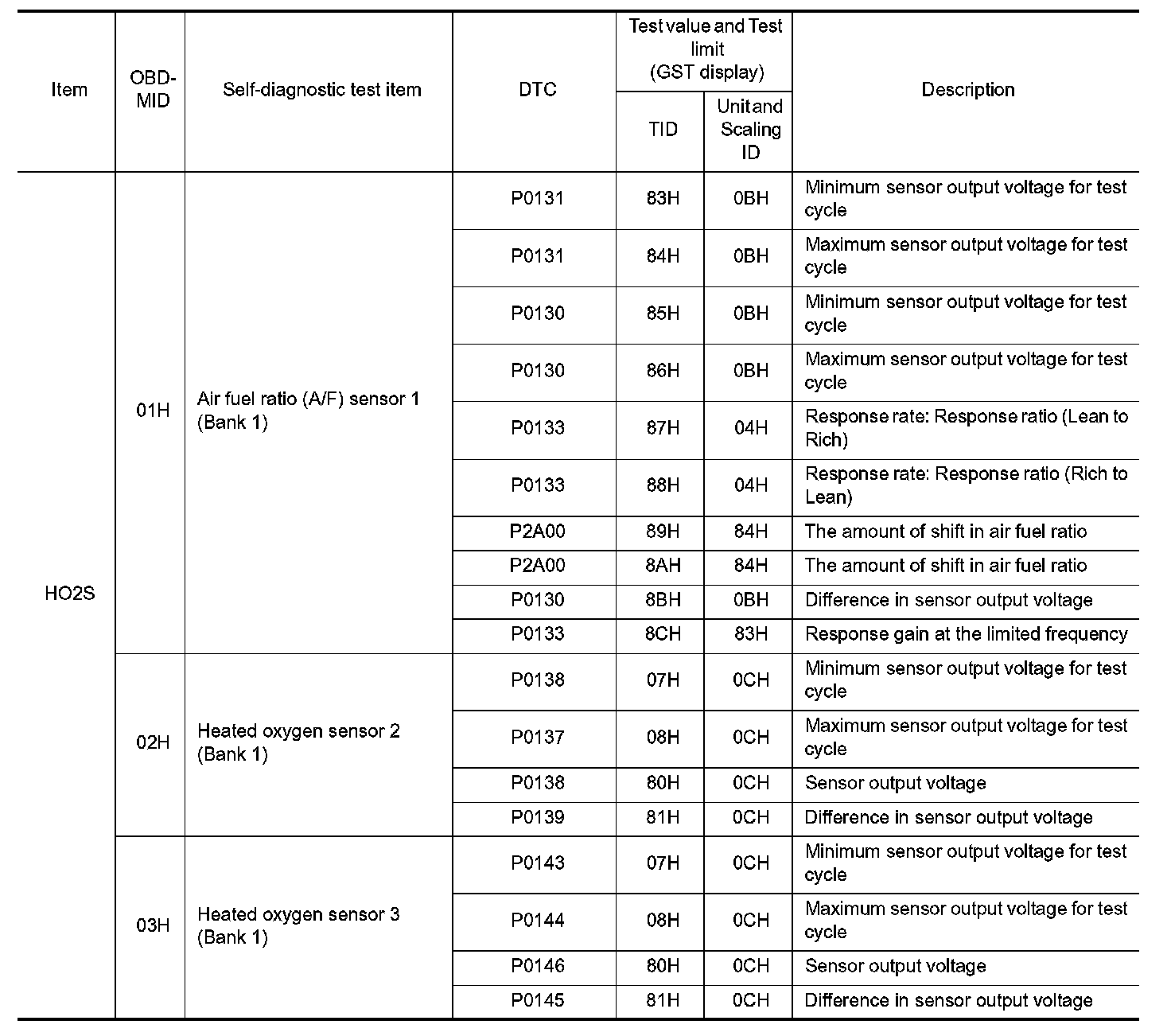 These data (test value and test limit) are specified by On Board Monitor ID(OBDMID), Test ID (TID), Unit and Scaling ID and can be displayed on the GST screen.