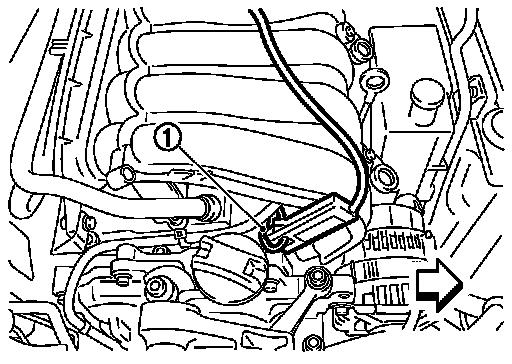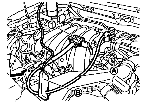 2. Connect No. 4 ignition coil (1) and No. 4 spark plug with suitable high-tension wire (A) as shown, and attach timing light clamp (B) to this wire.