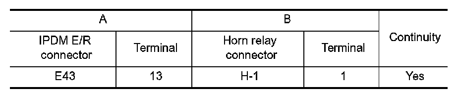 3. Check continuity between IPDM E/R harness connector and horn relay harness connector.