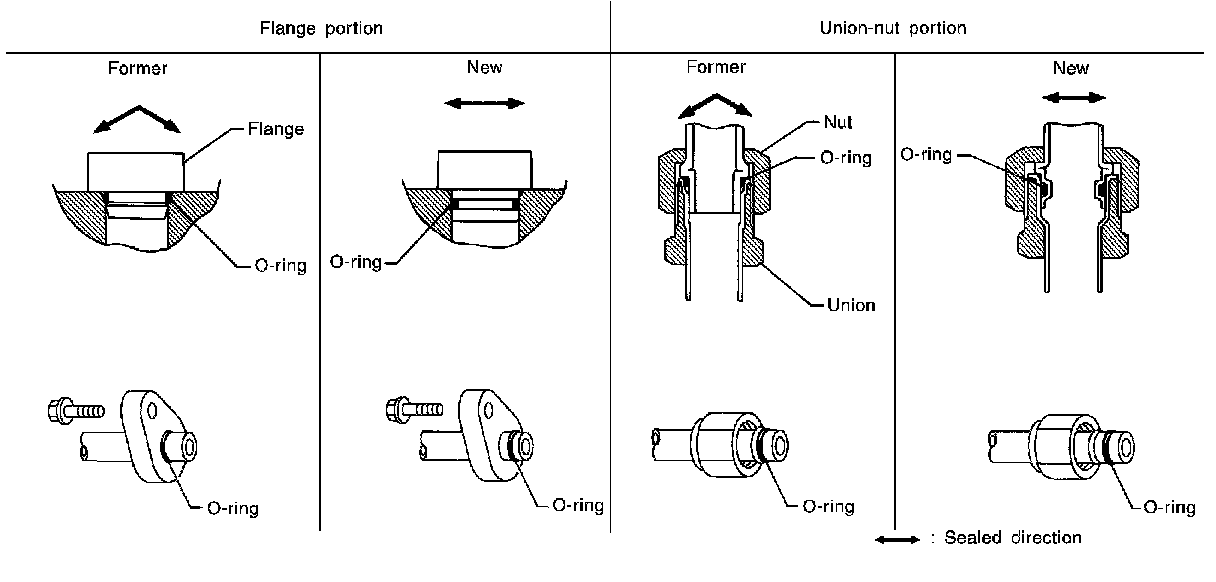 - The O-ring has been relocated. It has also been provided with a groove for proper installation. This eliminates the chance of the O-ring being caught in, or damaged by, the mating part. The sealing direction of the O-ring is now set vertically in relation to the contacting surface of the mating part to improve sealing characteristics.