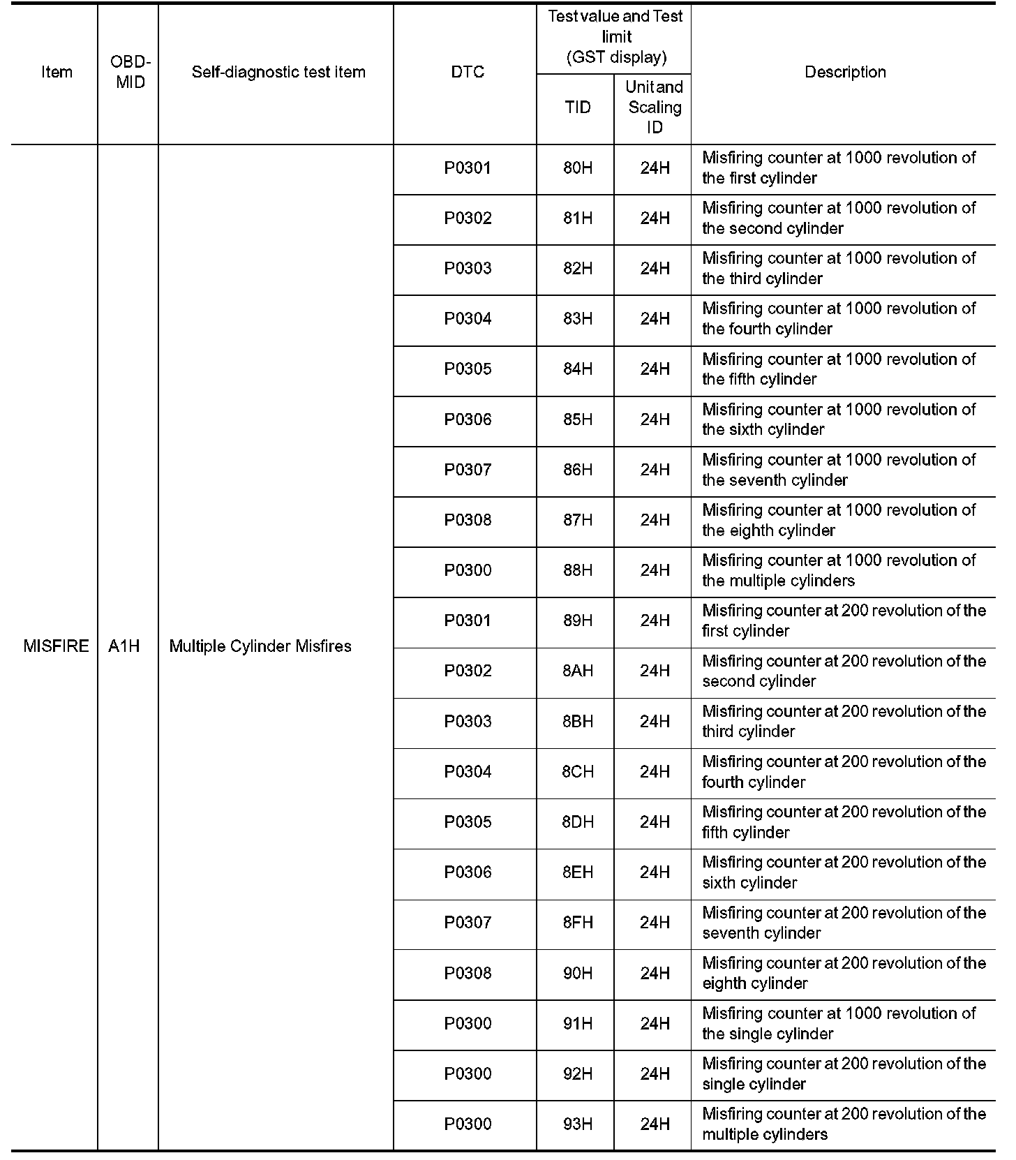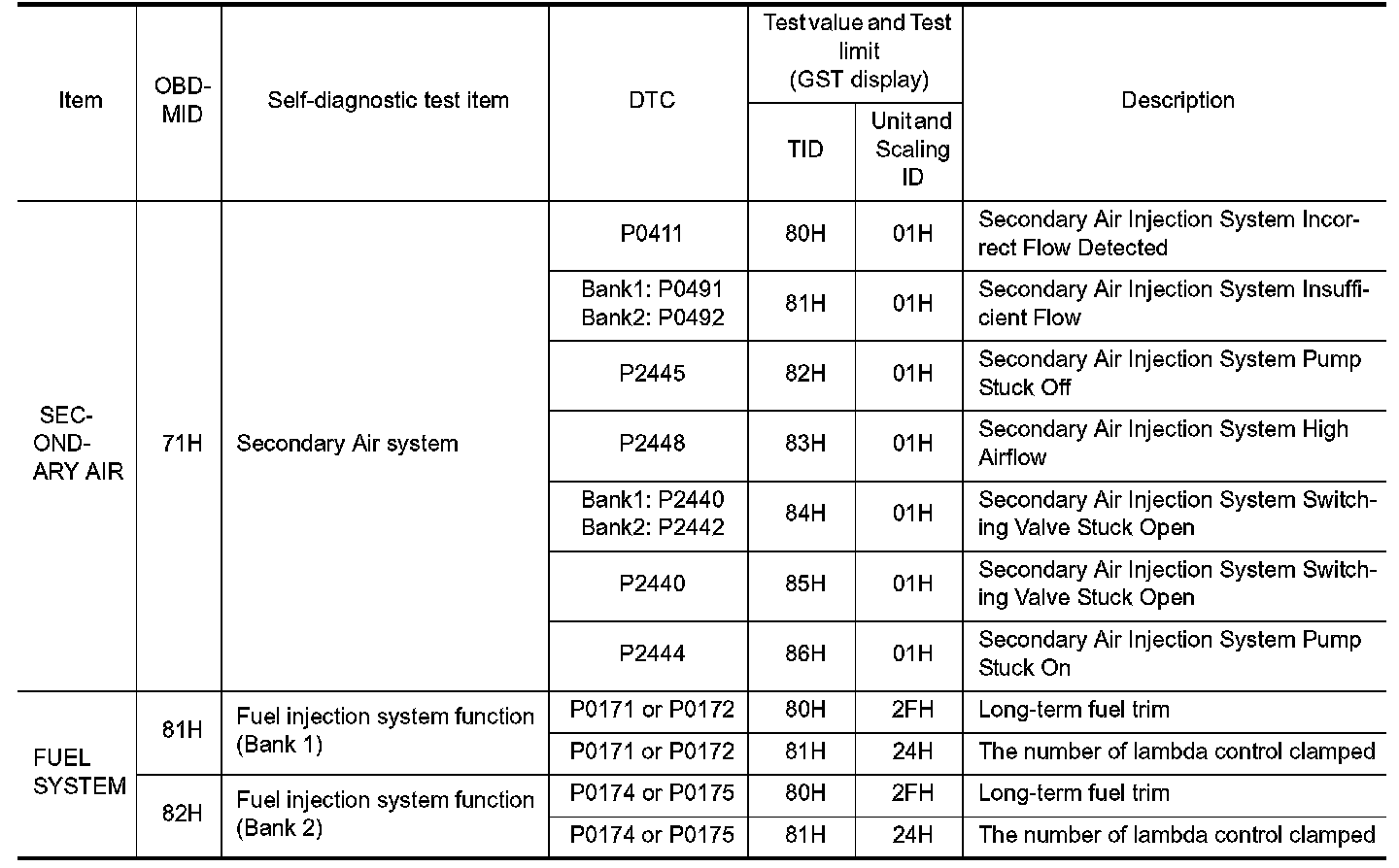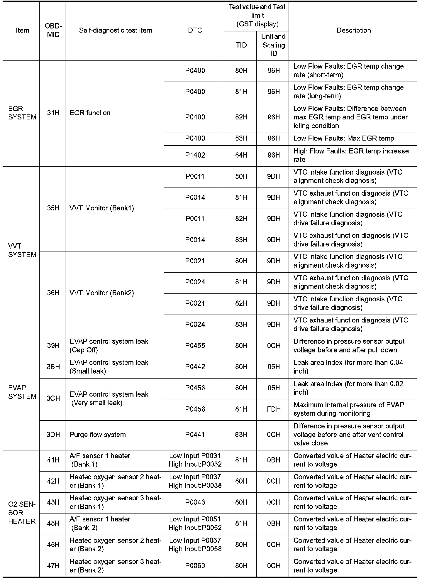 These data (test value and test limit) are specified by On Board Monitor ID(OBDMID), Test ID (TID), Unit and Scaling ID and can be displayed on the GST screen.
