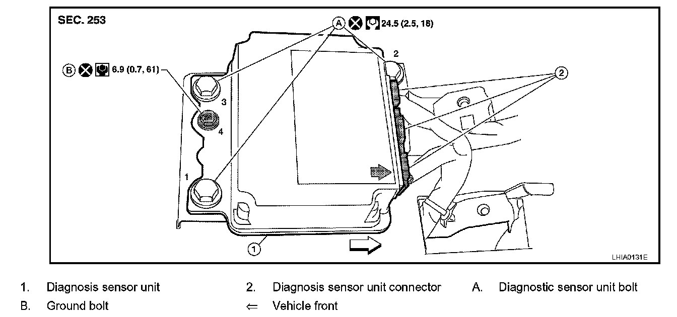 - The diagnosis sensor unit must always be installed with the arrow mark "<-" pointing toward the front of the vehicle for proper operation.