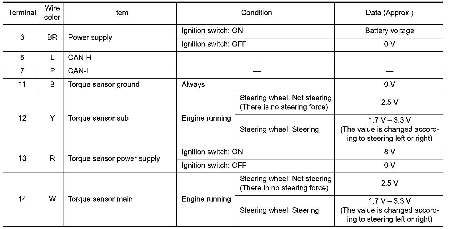 TERMINALS AND REFERENCE VALUES FOR EPS CONTROL UNIT