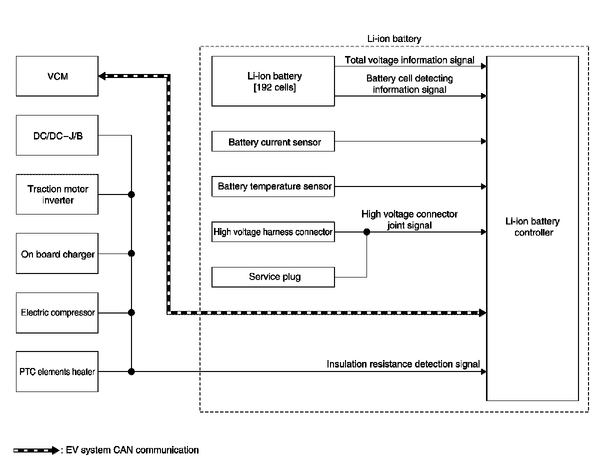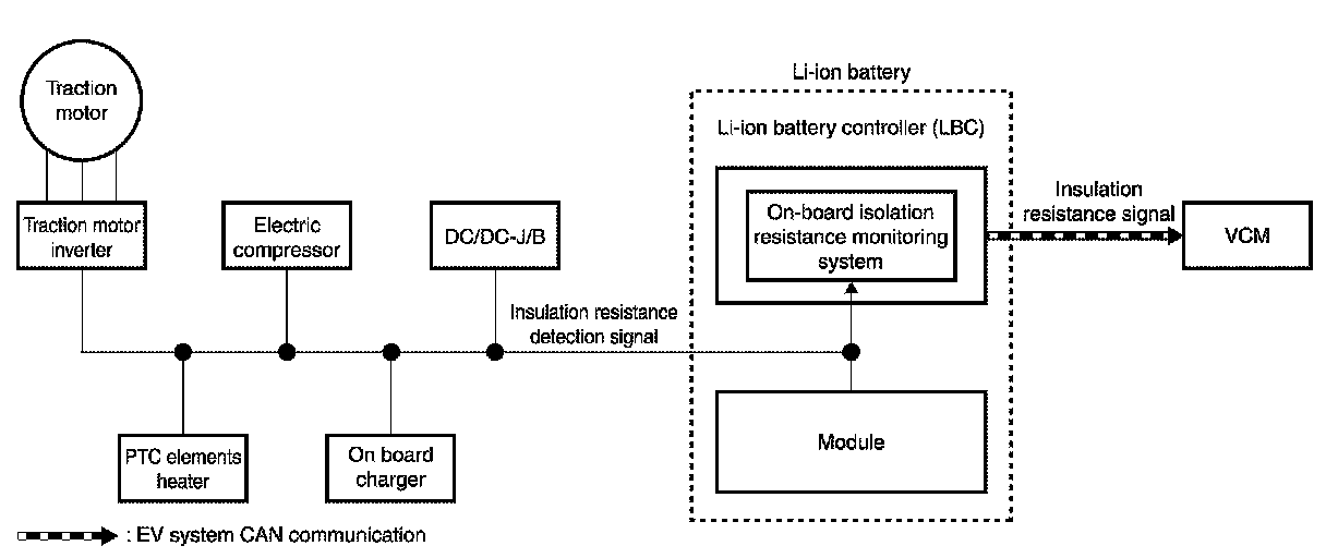 The insulation resistance detection circuit mounted inside the Li-ion battery controller measures the insulation resistance of each high voltage part and sends the measurement results to VCM via EV system CAN communication.