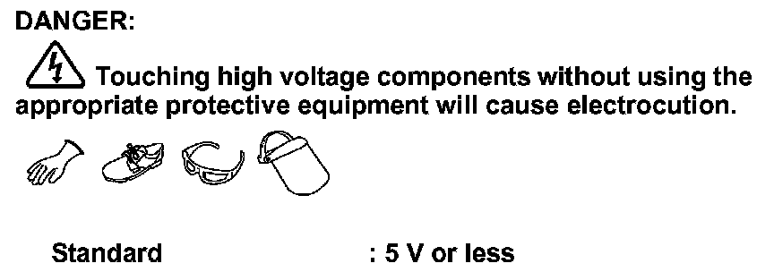 - Be sure to wear insulating protective equipment consisting of glove, shoes, face shield and glasses before beginning work on the high voltage system.