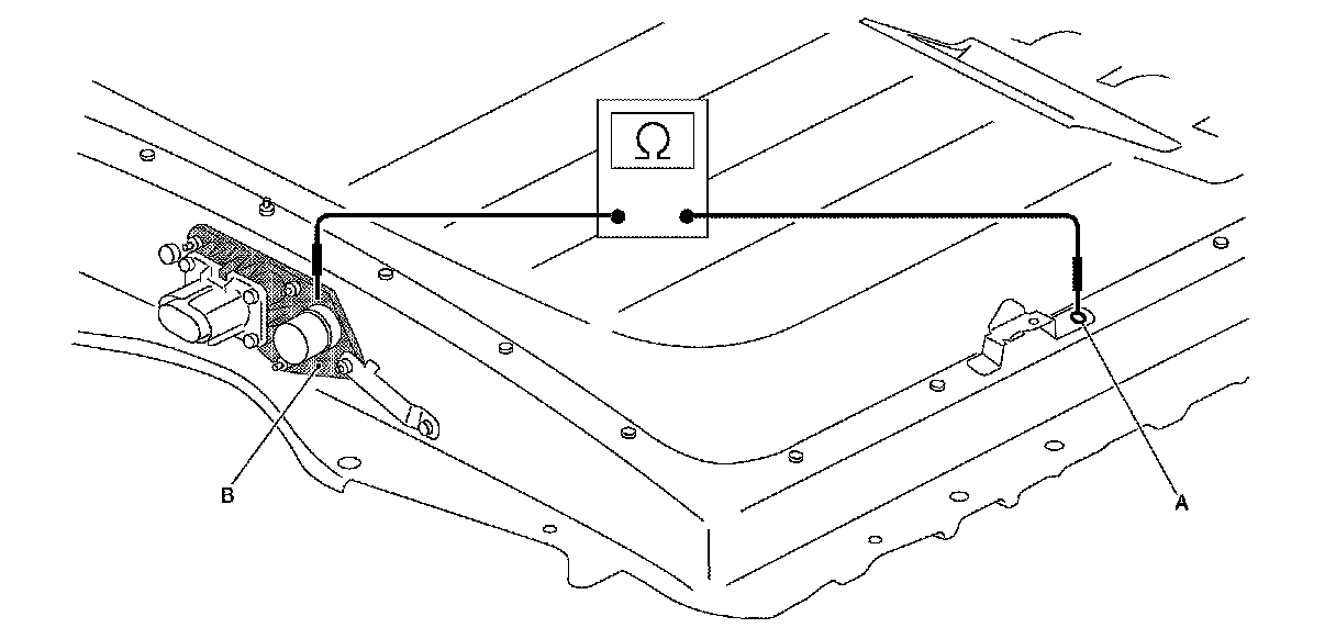 After installing the battery pack, measure the resistance between the ground bolt mating surface (A) and the high voltage harness connector flange (B).