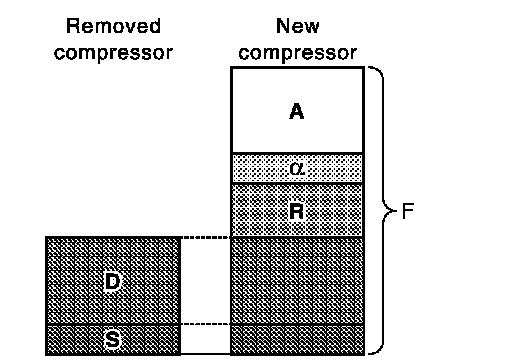 150 (5.1, 5.3) [60 (2.0, 2.1) + 20 (0.7, 0.7) + 5 (0.2, 0.2) + 5 (0.2, 0.2)] = 60 (2.0, 2.1) from the new compressor.
