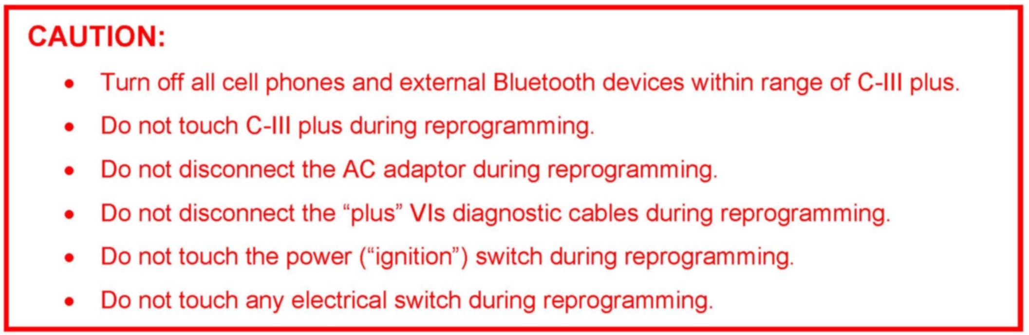 > If a Mobile Technician performs the reprograms, make sure a fully charged 12V battery (with jumper cables) or portable battery charger is used.