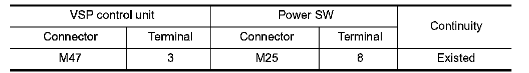 3.Check continuity between VSP control unit harness connector and power switch harness connector.
