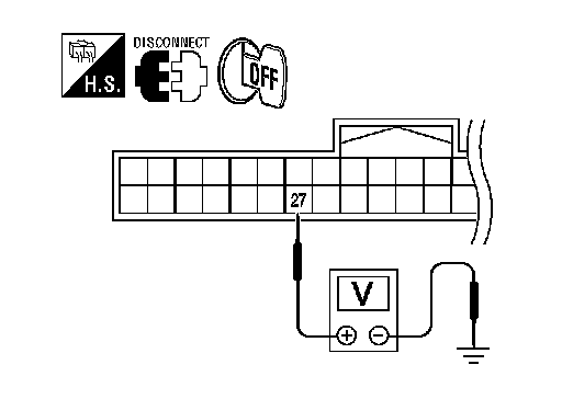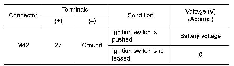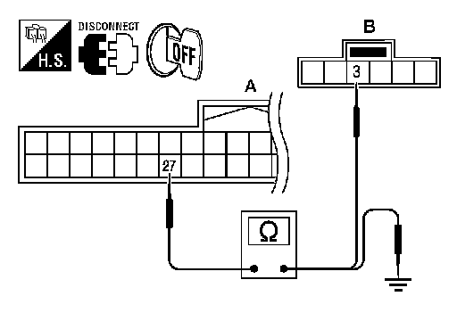 1. Check continuity between Intelligent Key unit harness connector M42 (A) terminal 27 and key switch and ignition knob switch harness connector M49 (B) terminal 3.