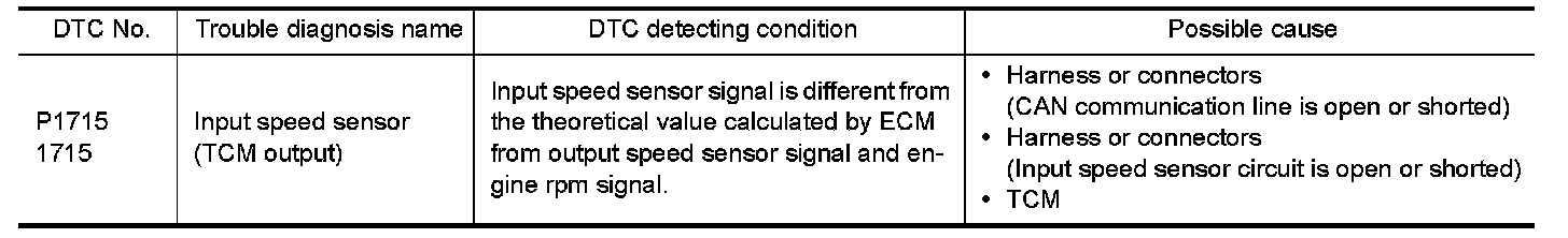 - If DTC P1715 is displayed with DTC P0335, first perform the trouble diagnosis for DTC P0335. Engine Controls (For California) Engine Controls (For California) Engine Controls (For California) Engine Controls (For California).