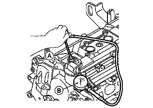 7. Install a suitable compression tester (B) with an adapter (A) onto spark plug hole.
