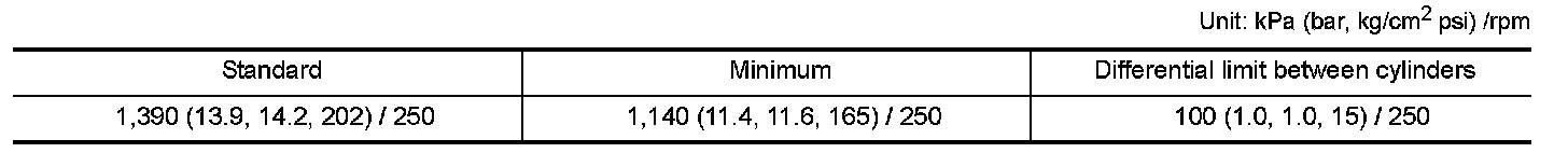 - If compression pressure is below minimum value, check valve clearances and parts associated with combustion chamber (Valve, valve seat, piston, piston ring, cylinder bore, cylinder head, cylinder head gasket). After the checking, measure the compression pressure again.