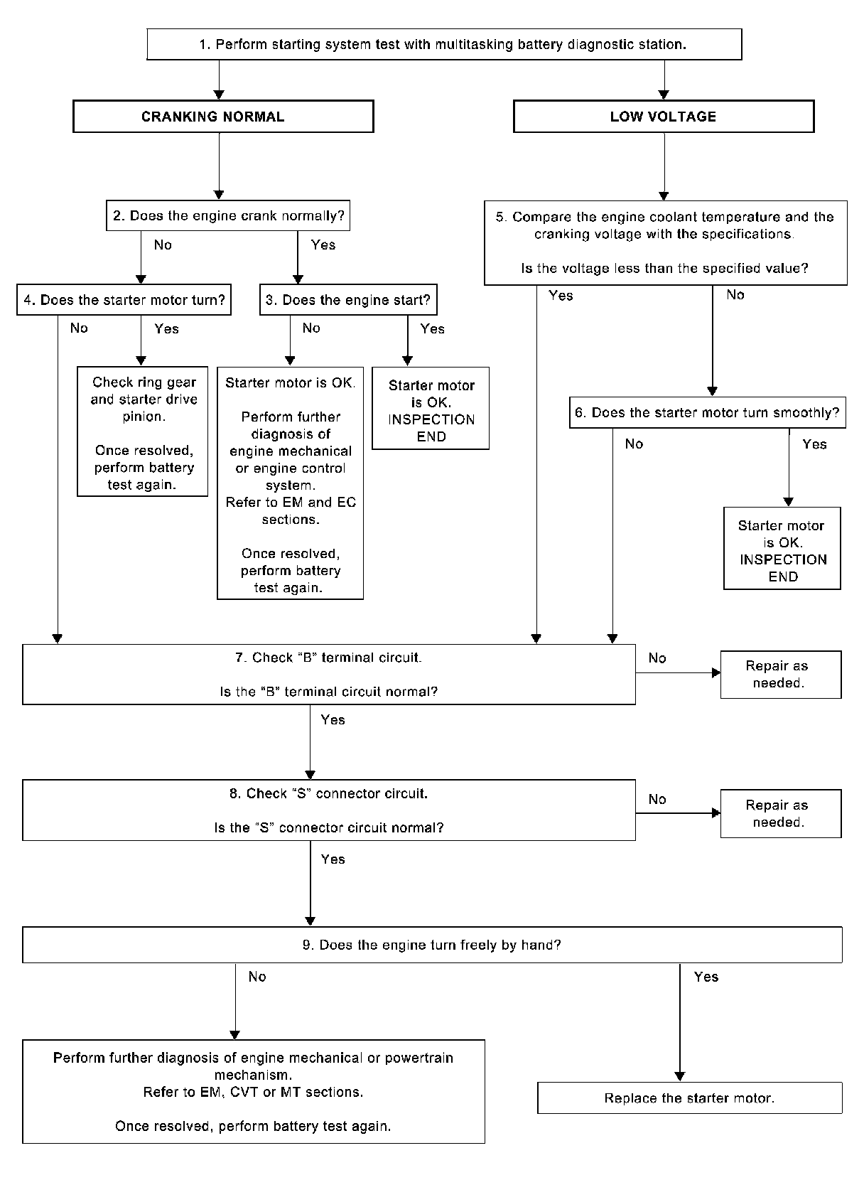 NG - Check harness between the battery and the starter motor for poor continuity.