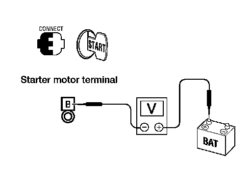 Check voltage between starter motor connector F27 terminal B and battery positive terminal using a digital circuit tester.