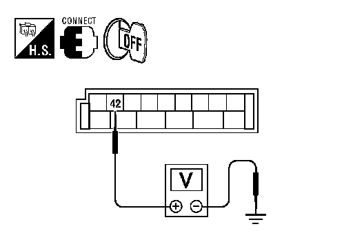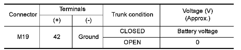 2. Check voltage between BCM harness connector M19 terminal 42 and ground.