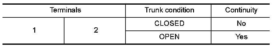 3. Check continuity between trunk room lamp switch terminals 1 and 2.