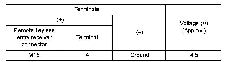 2. Check voltage between remote keyless entry receiver connector M15 terminal 4 and ground.