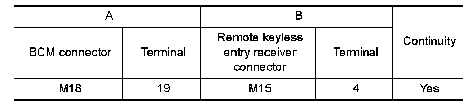 2. Check continuity between BCM connector M18 (A) terminal 19 and remote keyless entry receiver connector M15 (B) terminal 4.
