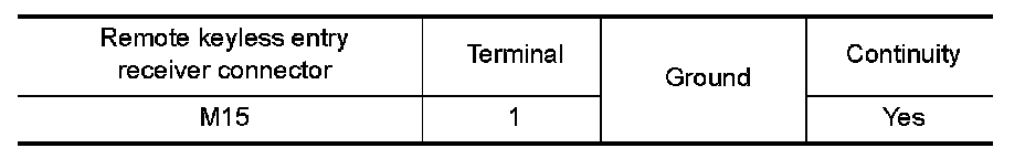 Check continuity between remote keyless entry receiver connector M15 terminal 1 and ground.
