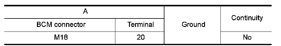 2. Check continuity between BCM connector (A) M18 terminal 20 and ground.