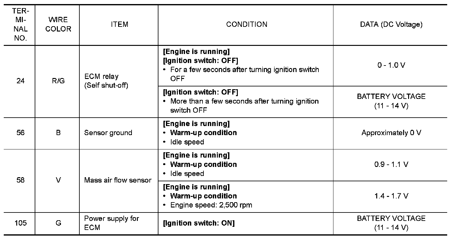 Never use ECM ground terminals when measuring input/output voltage. Doing so may result in damage to the ECM's transistor. Use a ground other than ECM terminals, such as the ground.