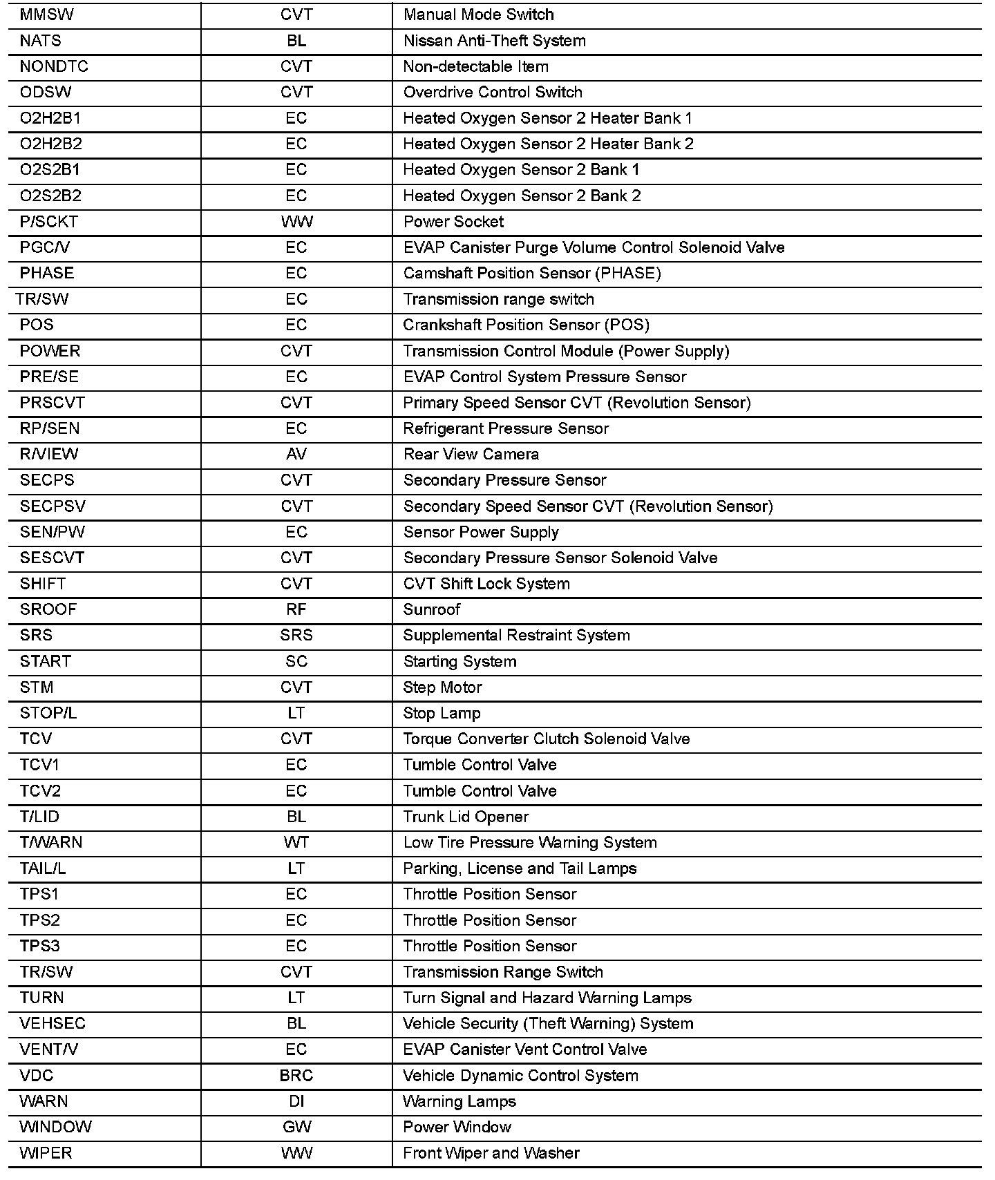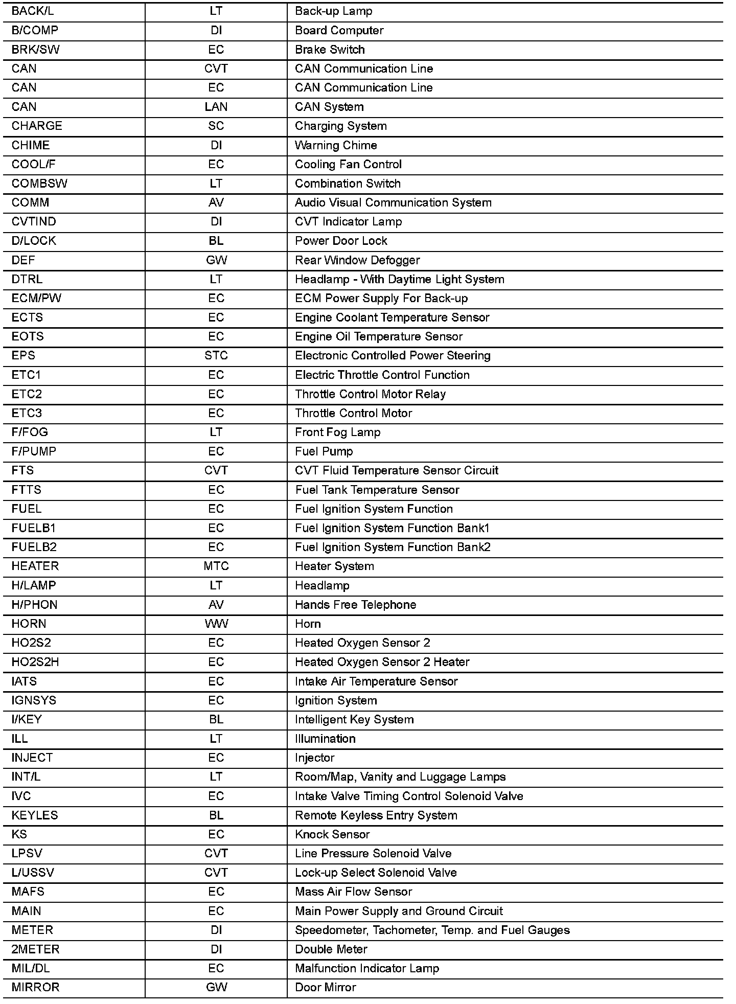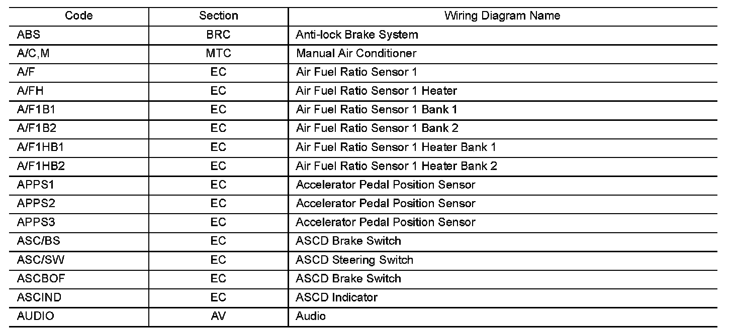 Use the chart below to find out what each wiring diagram code stands for. Refer to the wiring diagram code in the alphabetical index to find the location of each wiring diagram.