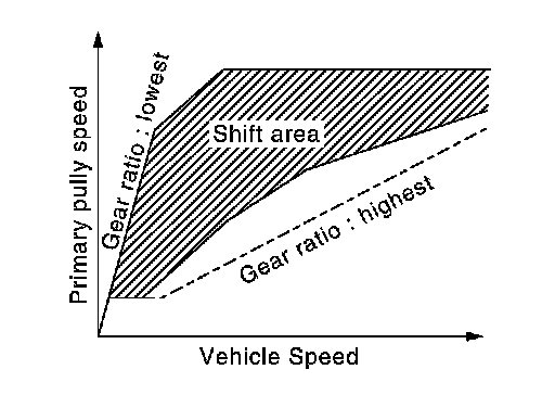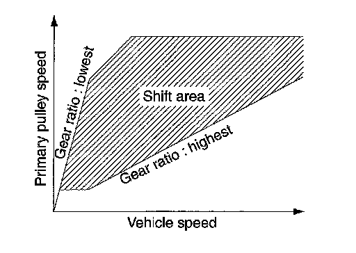 In order to select the gear ratio which can obtain the driving force in accordance with driver's intention and the vehicle condition, TCM monitors the driving conditions, such as the vehicle speed and the throttle position and selects the optimum gear ratio, and determines the gear change steps to the gear ratio. Then send the command to the step motor, and control the flow-in/flow-out of line pressure from the primary pulley to determine the position of the moving-pulley and control the gear ratio.