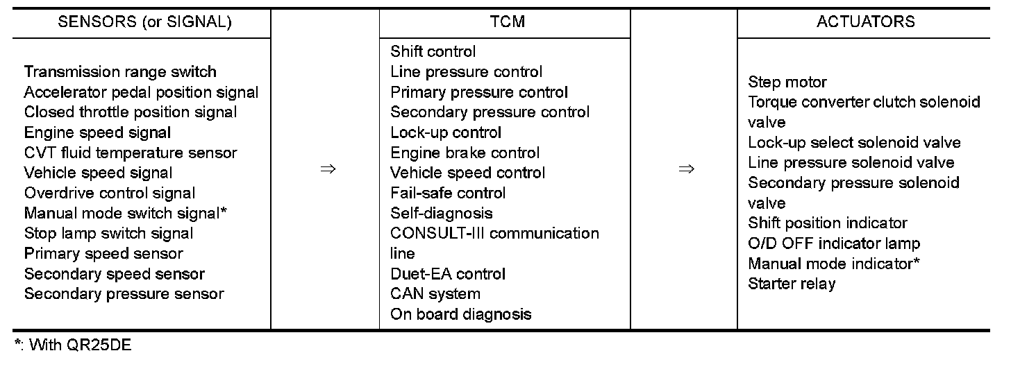 The CVT senses vehicle operating conditions through various sensors. It always controls the optimum shift position and reduces shifting and lock-up shocks.