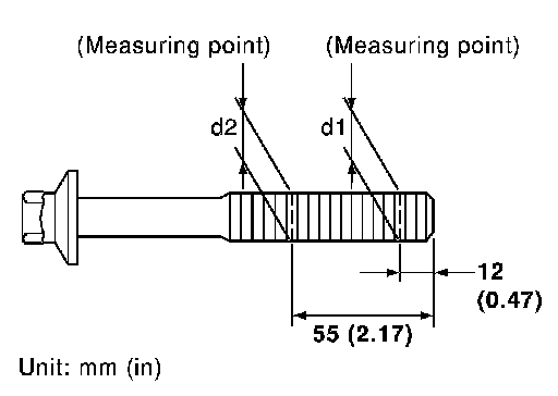 Cylinder head bolts are tightened by plastic zone tightening method. Whenever the size difference between d1 and d2 exceeds the limit, replace the bolts with new ones.